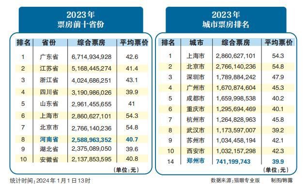 從2023年春節檔開始,整個2023年,全國電影市場拿下了全年549.15億元的總票房。貓眼專業版數據顯示,2023年全年各省份票房中,河南省以25.9億元的票房位列第8名,鄭州市以7.4億