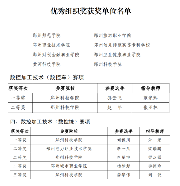 近日,鄭州市教育局公布了第八屆鄭州地方高校職業技能競賽結果的通知。鄭州科技學院榮獲優秀組織單位獎,其中,實踐中心教師朱光、范光輝、張亞林、梁漢猛、劉波等指導的學