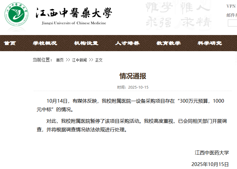 江西中醫藥大學表示,學校附屬醫院暫停了該項目采購活動,同時稱對此高度重視,已會同相關部門開展調查,并將根據調查情況依法依規進行處理。