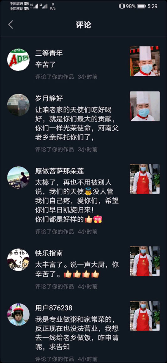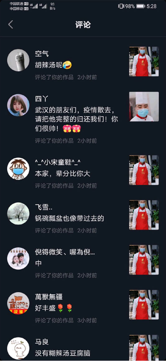 忙完以后我倆拍了個抖音記錄一下在武漢的點滴,沒想到關注度蠻高的,好多網友紛紛留言支持和鼓勵!網友@四丫說道:武漢的朋友們,疫情散去,請把他完整的歸還我們!你們很帥!看到這些,我心里是滿滿的感動!關注度比較高的還有老家味道胡辣湯,油條,豆腐腦,西瓜醬!