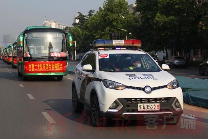 高考期間,鄭州市二七區(qū)馬寨鎮(zhèn)公安路上的澍青醫(yī)學(xué)專(zhuān)科學(xué)校出動(dòng)39輛大巴車(chē),載著考生分別到鄭州73中、國(guó)防科技學(xué)校和興華街小學(xué)集中乘車(chē)參加高考,鄭州市交警二大隊(duì)安排警用汽車(chē)和摩托車(chē)在大巴車(chē)前方實(shí)施滾動(dòng)警衛(wèi),為考生車(chē)隊(duì)警車(chē)開(kāi)道。