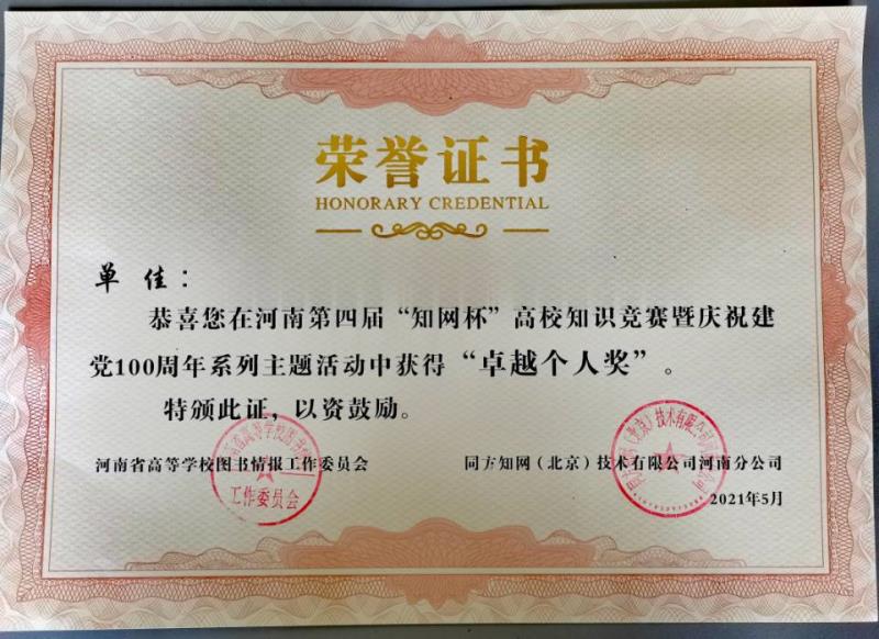近日,從河南省第四屆“知網(wǎng)杯”高校知識發(fā)現(xiàn)有獎(jiǎng)競賽河南賽區(qū)組委會傳來消息,鄭州科技學(xué)院圖書館榮獲“優(yōu)秀組織獎(jiǎng)”,王文華、單佳、王曉夢等28位同學(xué)榮獲省賽“卓越個(gè)人獎(jiǎng)”。