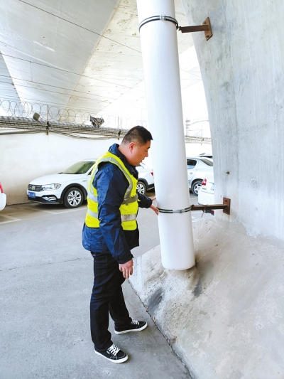 崔健在建設路立交橋下,巡查橋墩和橋梁排水情況。