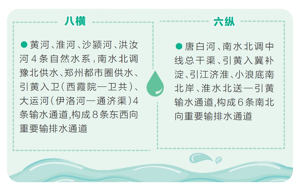 八橫,即黃河、淮河、沙潁河、洪汝河4條自然水系,南水北調(diào)豫北供水、鄭州都市圈供水、引黃入衛(wèi)(西霞院—衛(wèi)共)、大運(yùn)河(伊洛河—通濟(jì)渠)4條輸水通道,構(gòu)成8條東西向重要輸排水通道。