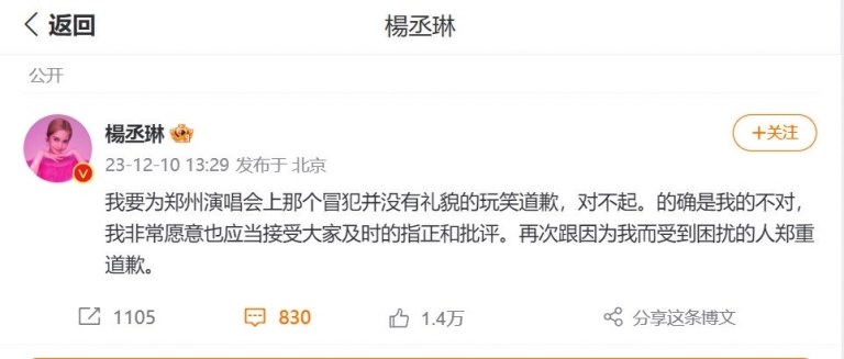 12月10日,楊丞琳通過社交媒體發表道歉聲明。據媒體報道,目前有多位市民向有關部門投訴,認為楊丞琳傷害了河南人的感情,要求對其進行處理。