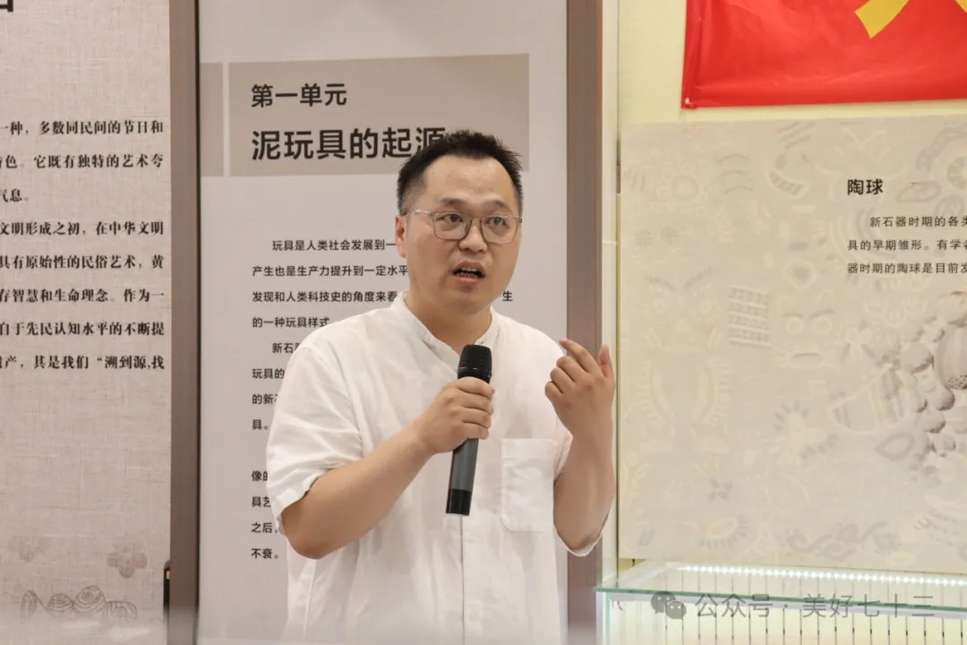 展覽分為靜態(tài)展示區(qū)、互動體驗區(qū)和影像展示區(qū)三大板塊,全方位展示了黃河流域泥玩具的歷史變遷、藝術(shù)特色及制作工藝。策展人孟俊峰博士親自導(dǎo)覽,生動講解,讓觀眾深入了解了泥玩具背后豐富的文化知識。此外,七十三中美術(shù)教師姚華蓉細(xì)致介紹了學(xué)校將非遺資源轉(zhuǎn)化為課程資源的實踐經(jīng)驗,并展示了通過校本課程培養(yǎng)出的泥玩具創(chuàng)作新星,凸顯了學(xué)校在非遺美育上的創(chuàng)新與實踐。