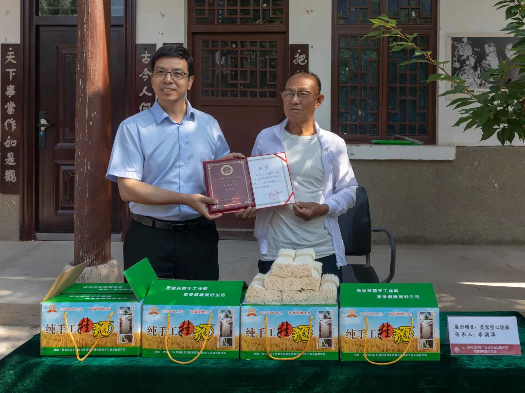 活動(dòng)期間,三門峽市文化廣電和旅游局三級(jí)調(diào)研員鄧偉華等人向三門峽市第七批非遺傳承人頒發(fā)了證書和匾牌。