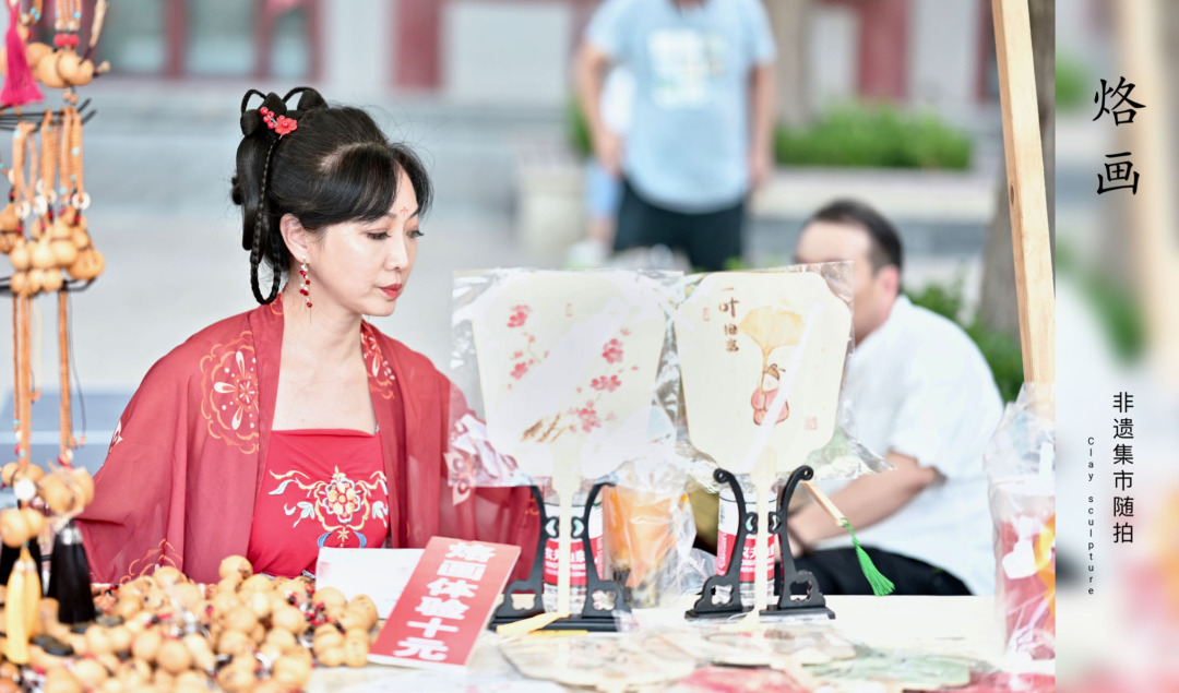 逛市集,慢賞“非遺之美”。在市集現場,各級各類非遺項目百花齊放,各顯神通。在節目展演互動區,廣場中央的小舞臺上,嗩吶、二夾弦、古琴、武術、曲藝、宋詞樂舞……各種非遺表演輪番登場。在傳統技藝體驗區,宋代雅集“點茶、焚香、插花、古琴”等互動體驗項目,讓人們得以親手觸摸歷史,親身體驗宋文化的優雅與精致。剪紙面塑、年畫風箏等非遺傳承人現場授藝,營造出濃厚的市井氣息與藝術氛圍,使參與者仿佛置身于千年前的“東京夢華”之中,沉浸式地品味“非遺之美”。