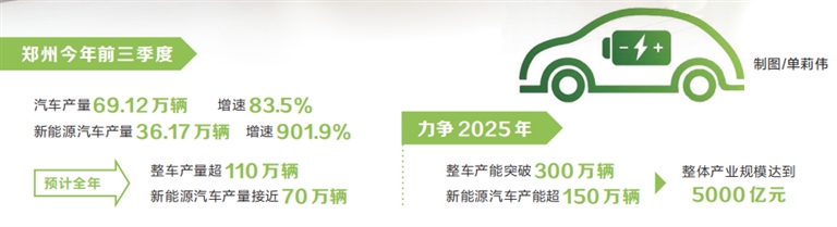 “今年前三季度,鄭州汽車產量69.12萬輛、增速83.5%,新能源汽車產量36.17萬輛、增速901.9%。預計全年整車產量超110萬輛,新能源汽車產量接近70萬輛。”鄭州市政府相關負責人表示,鄭州正在加快建設全國重要的新能源及智能網聯汽車研發和生產基地,力爭2025年整車產能突破300萬輛、新能源汽車產能超150萬輛,整體產業規模達到5000億元。
