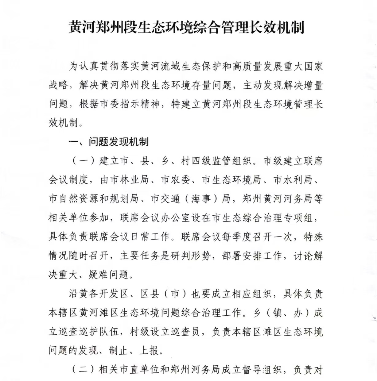 另外,記者還了解到,鄭州市還于2020年11月23日印發(fā)了鄭州市建設(shè)黃河高質(zhì)量發(fā)展流域生態(tài)保護和高質(zhì)量發(fā)展核心示范區(qū)工作領(lǐng)導小組文件——《黃河鄭州段生態(tài)環(huán)境綜合管理長效機制》,其中提到,關(guān)于黃河鄭州段的生態(tài)環(huán)境綜合治理問題,鄭州專門設(shè)立有市級聯(lián)席會議制度,要求沿黃各開發(fā)區(qū)、區(qū)縣(市)也要成立相應組織。鄉(xiāng)(鎮(zhèn)、辦)成立巡查巡護隊伍,村級設(shè)立巡查員,