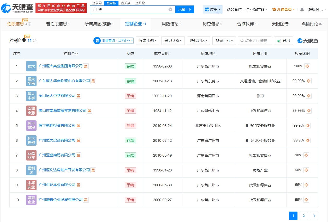 天眼查任職信息顯示,丁玉梅關聯(lián)3家企業(yè),其中2家為存續(xù)或開業(yè)狀態(tài),分別為廣州創(chuàng)爾生物技術股份有限公司、廣州恒大實業(yè)集團有限公司,丁玉梅在上述企業(yè)中擔任法定代表人、董事長兼總經(jīng)理。通過直接或間接持股,丁玉梅擁有10余家企業(yè)的實際控制權,其中多數(shù)已被吊銷或注銷。