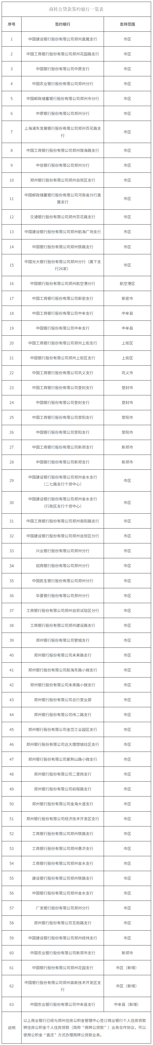 截至目前,已有63家商業(yè)銀行與鄭州住房公積金管理中心簽訂商業(yè)銀行個(gè)人住房貸款轉(zhuǎn)住房公積金個(gè)人住房貸款業(yè)務(wù)合作協(xié)議,可以使用公積金“直還”方式辦理商轉(zhuǎn)公貸款業(yè)務(wù)。具體名單如下:
