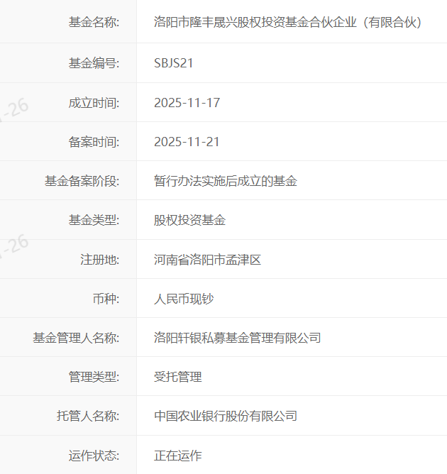 該基金注冊地位于洛陽市孟津區,規模3億元,洛陽隆騰資本運營集團直接持股90%,洛陽國晟產業投資基金直接持股9.67%。洛陽軒銀私募基金管理有限公司作為基金管理人,持股0.33%
