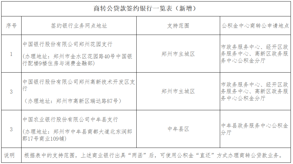 11月27日,鄭州住房公積金管理中心發(fā)布關(guān)于新增“商轉(zhuǎn)公貸款”簽約銀行的通知,中國(guó)銀行股份有限公司鄭州花園支行、中國(guó)銀行股份有限公司鄭州高新技術(shù)開(kāi)發(fā)區(qū)支行、中國(guó)農(nóng)