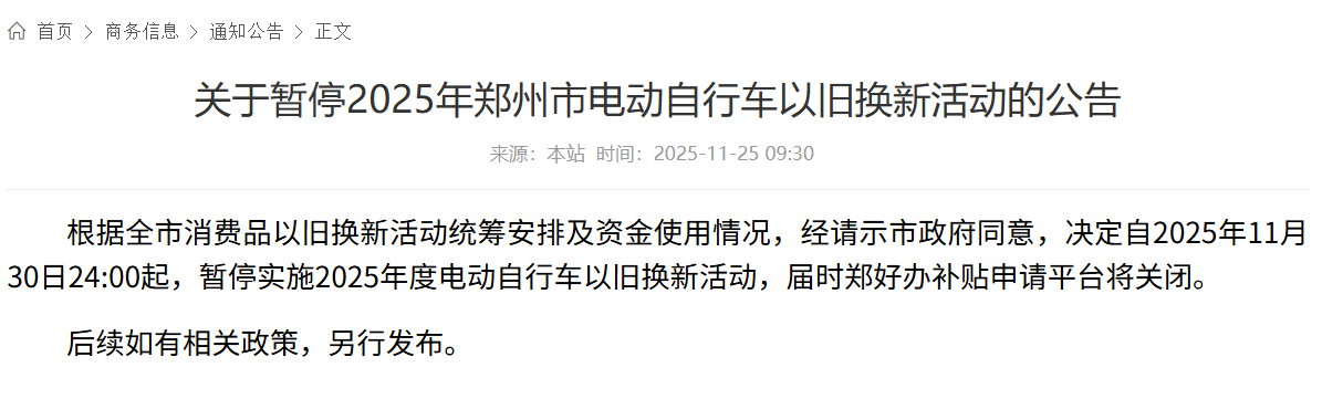 11月26日消息,鄭州市商務(wù)局發(fā)布公告稱,根據(jù)全市消費(fèi)品以舊換新活動(dòng)統(tǒng)籌安排及資金使用情況,經(jīng)請(qǐng)示市政府同意,決定自2025年11月30日24:00起,暫停實(shí)施2025年度電動(dòng)自行車以